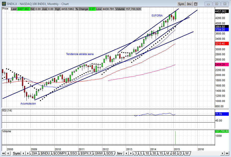 El mercado comienza a subir sin descansos y a entrar en lo que consideramos una clara etapa de euforia que se agudiza este mes en febrero de 2015 con una vela bastante fuerte y donde van ya 4 semanas al alza casi sin un descanso.